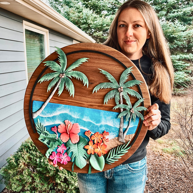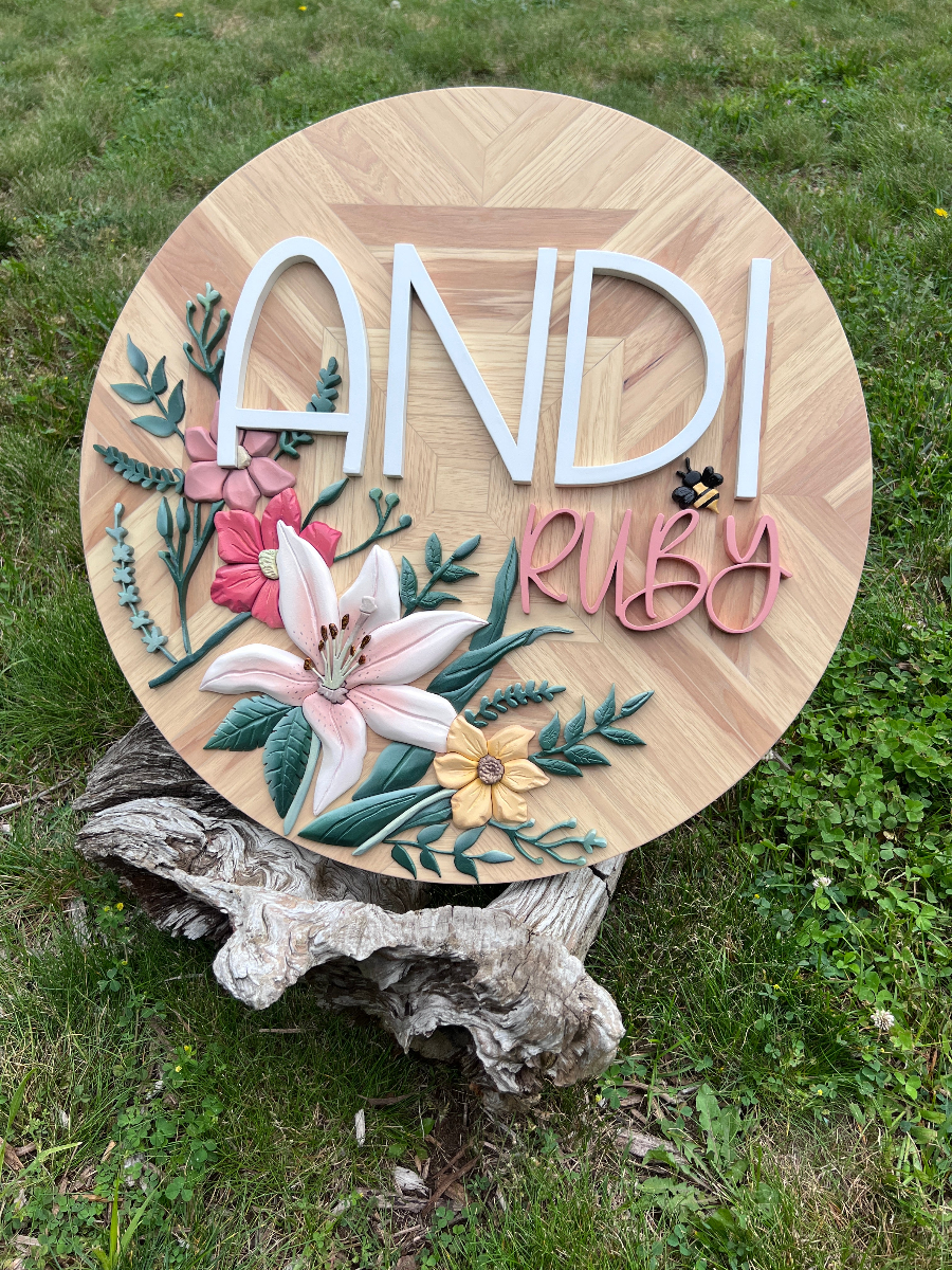 Each piece begins with a hand-drawn design, which is meticulously hand-cut on a scroll saw. Every piece of wood is then carefully carved, shaped and painted by hand, with each element thoughtfully crafted to bring your custom artwork to life.