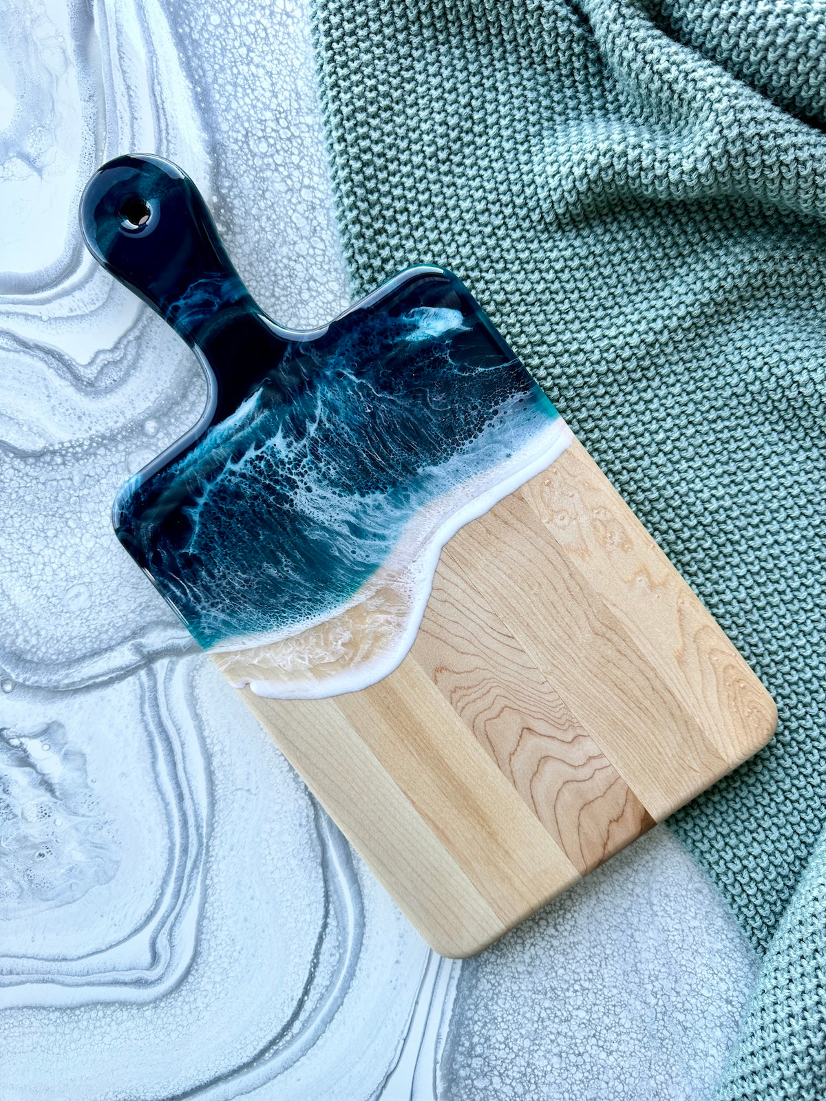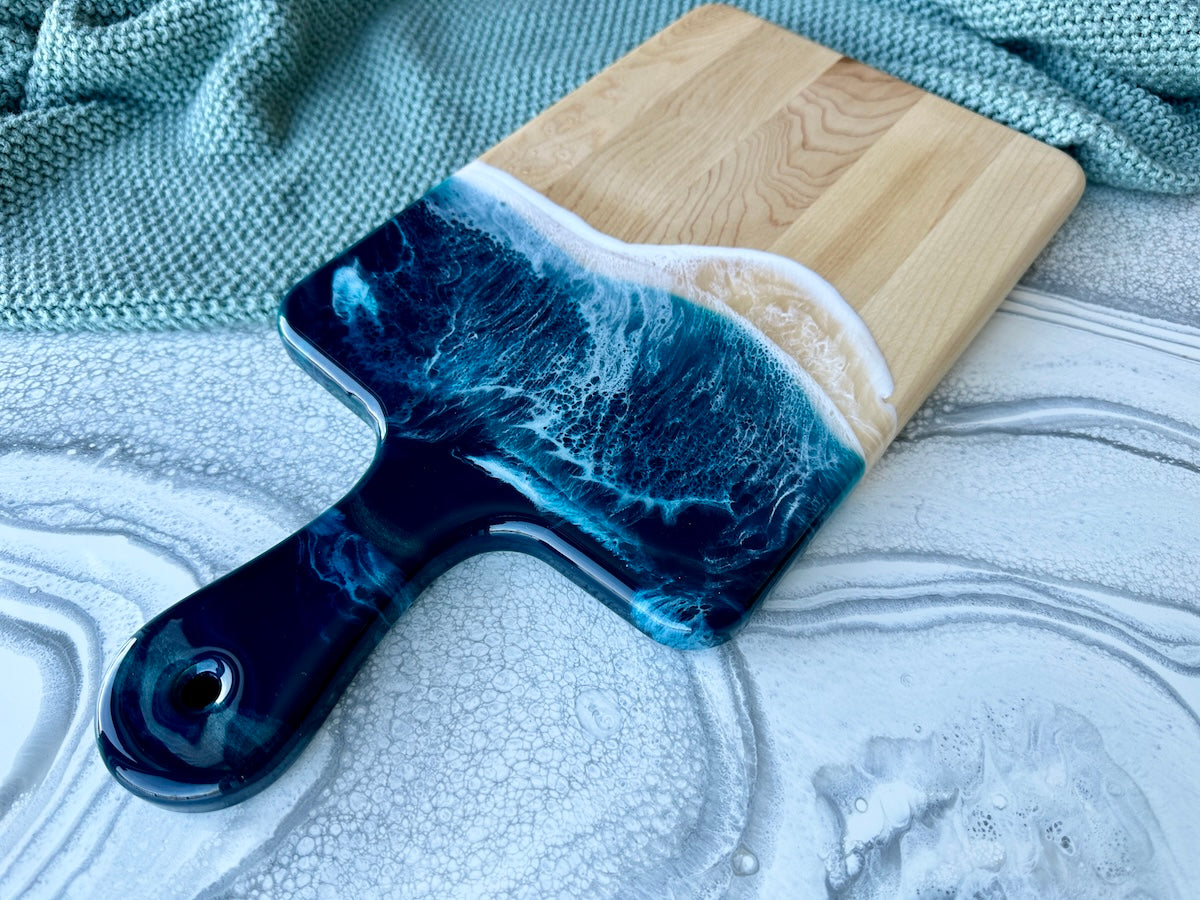 Cette planche à charcuterie en époxy d'inspiration côtière en érable est dotée d'une poignée avec des vagues de plage en époxy en bleu sarcelle et turquoise, avec un rivage blanc mousseux.