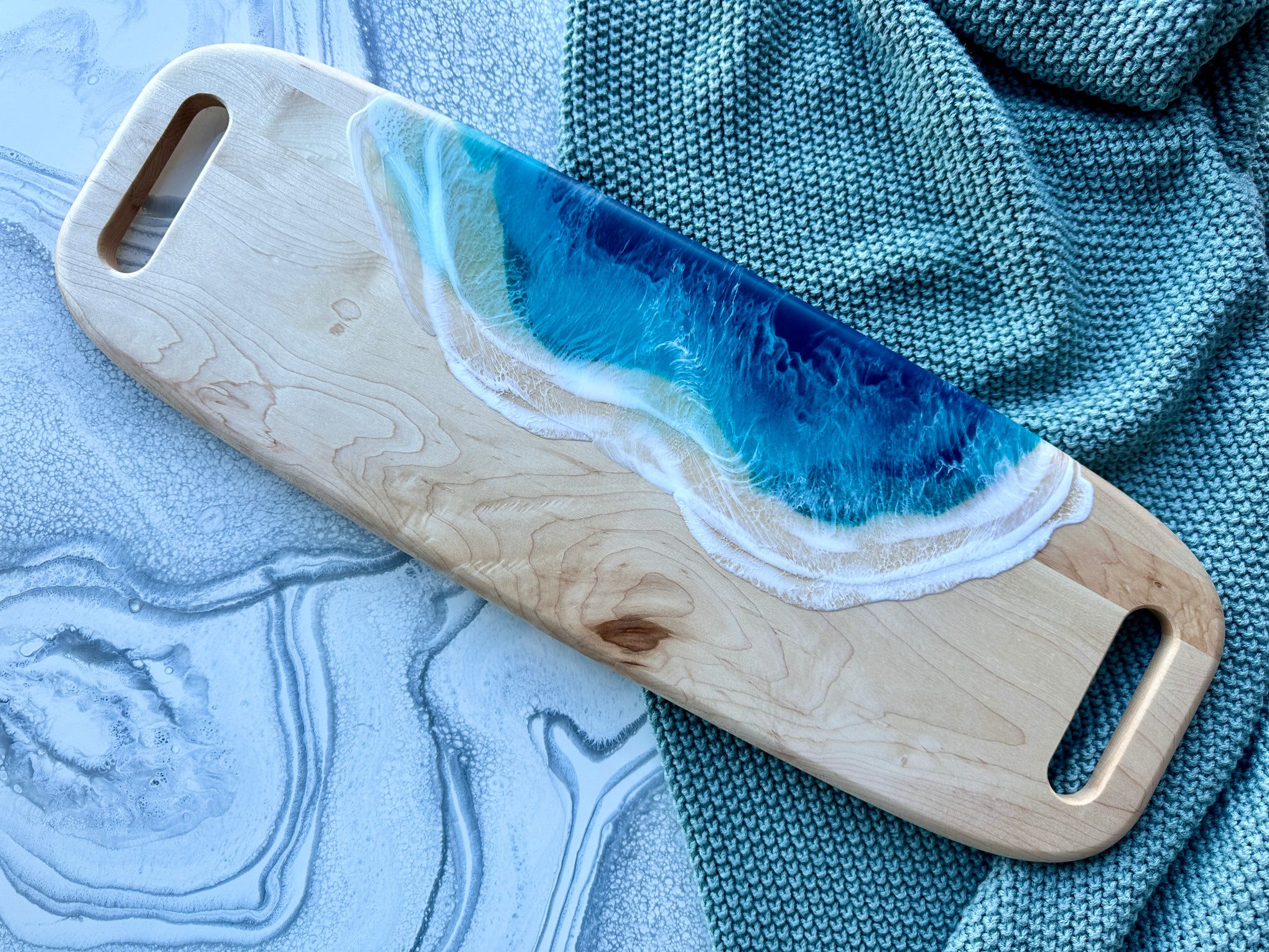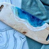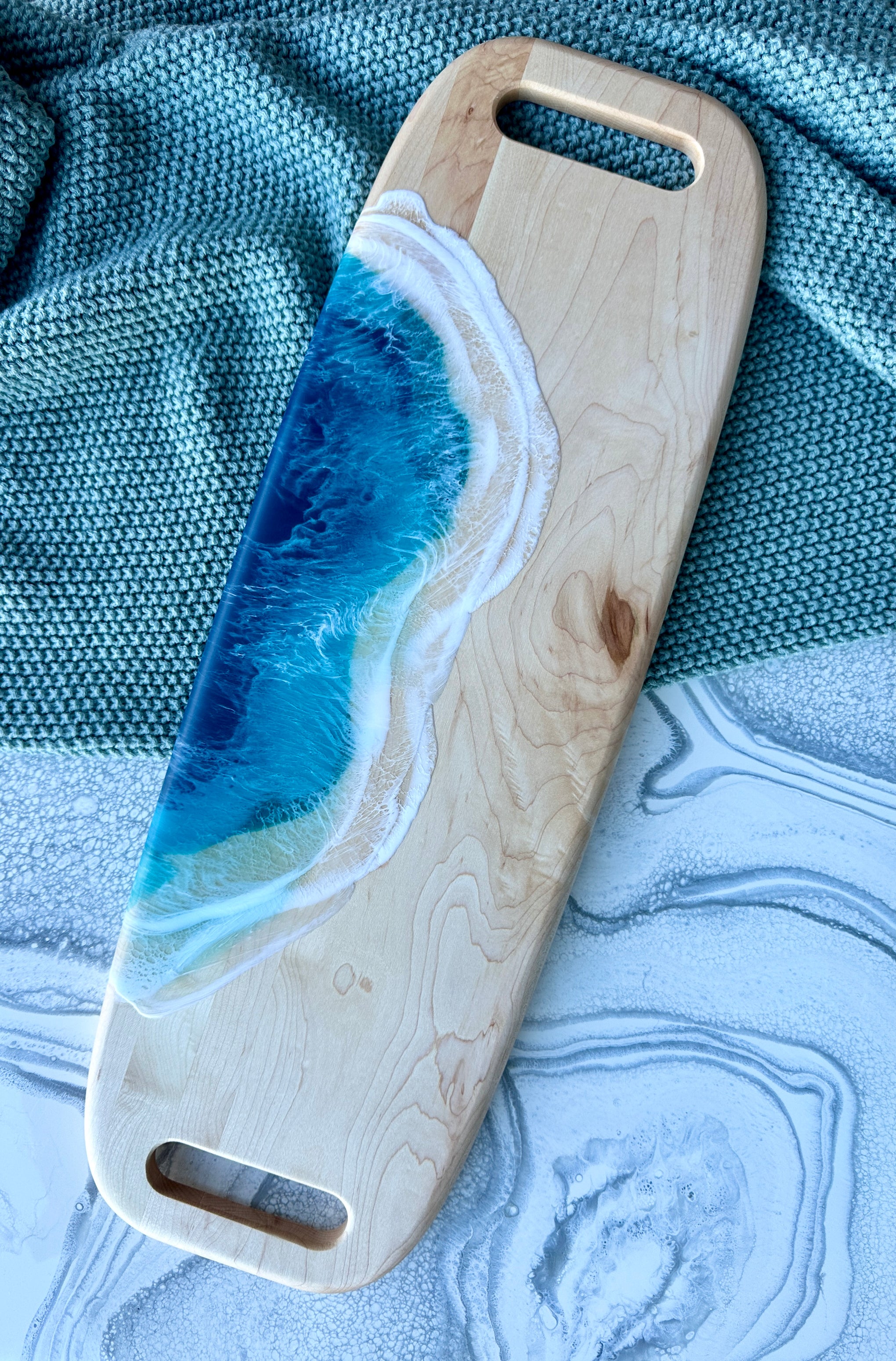 Cette planche à charcuterie en époxy d'inspiration côtière en érable est dotée d'une poignée avec des vagues de plage en époxy en bleu sarcelle et turquoise, avec un rivage blanc mousseux.